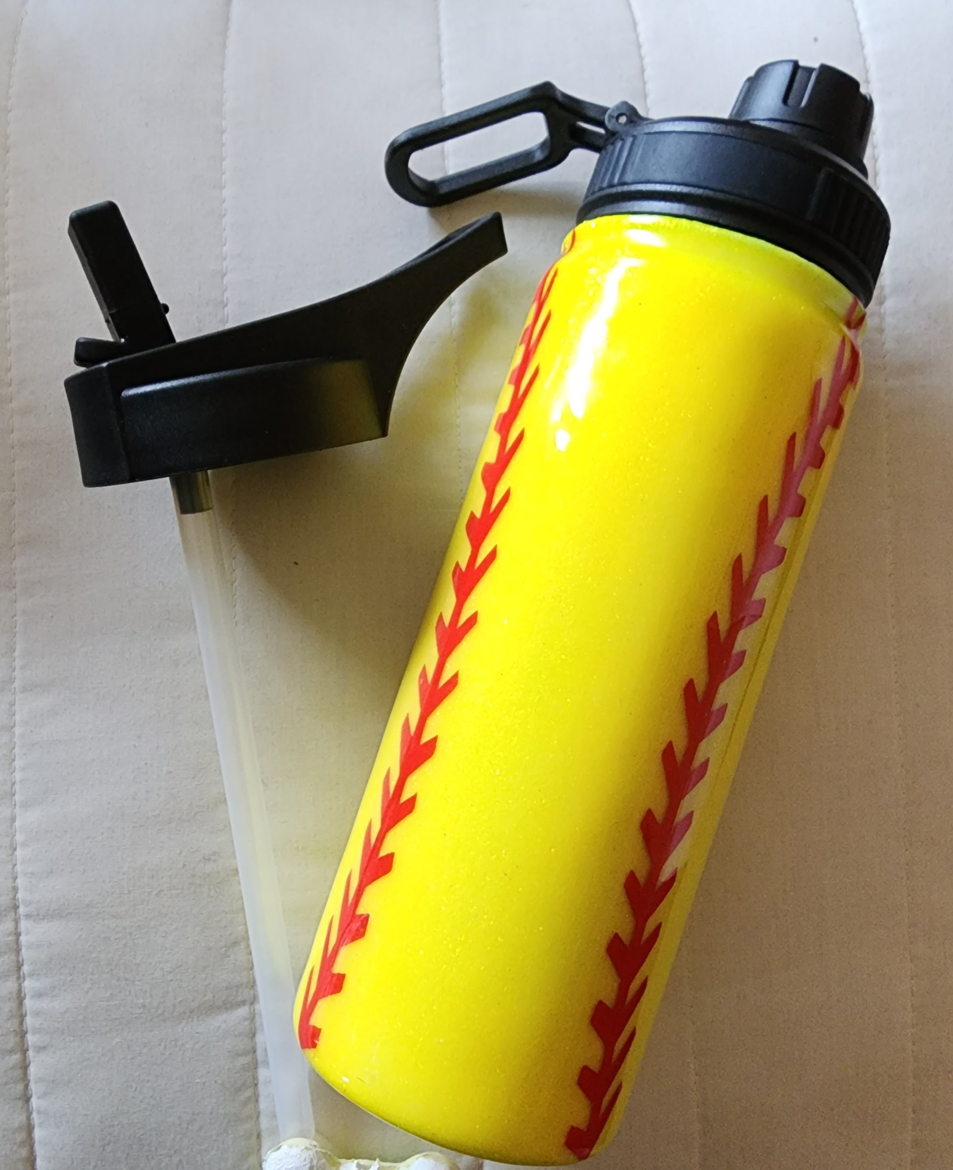 Our same daughter also plays on a travel ball team and I was asked to make all the players a softball water bottle with their name. This was the example I showed them. Each players name will be in the middle of the laces. This is also a 20 oz Duo Hydro. Here you can see the 2 lids that come with the bottle.